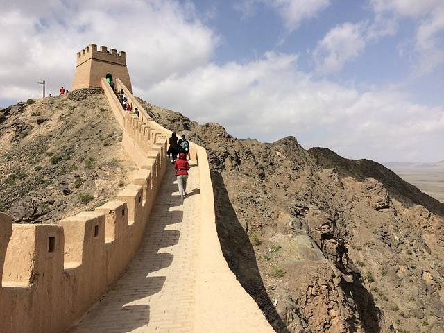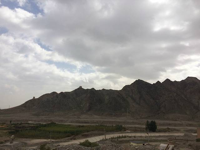 从关城向北约20分钟车程可达悬臂长城,此段长城从关城东闸门边的角墩起向北延伸至黑山山腰,全长7.5公里。山腰长城约750米,陡峭直长,气势雄伟,垂若悬臂,故有“西部八达岭”之称。用关城门票验证指纹进入。这段长城不太长,爬下来用不了1个小时。从长城上可以看到旁边有驻军部队。