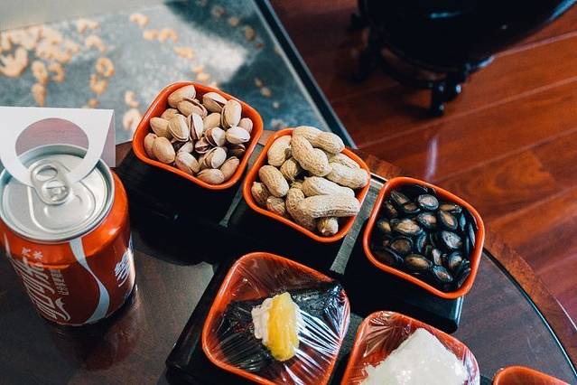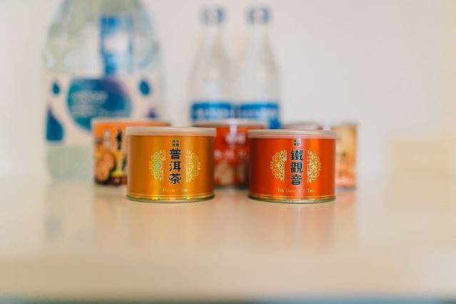 小吧台:除了矿泉水、纯净水,还准备了普洱茶、铁观音等种类的茶叶,另外提供了速溶咖啡、红茶、坚果之类。