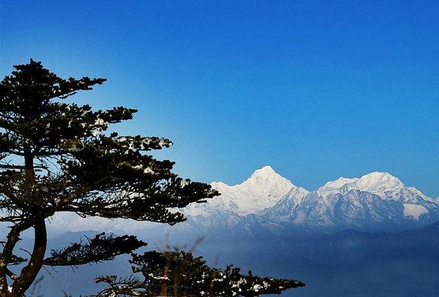 轿顶山古木参天,后面雪山映衬。