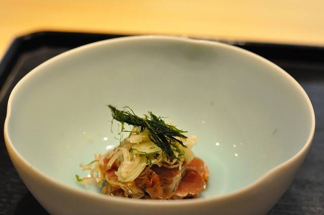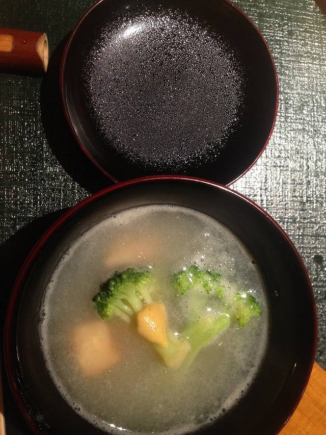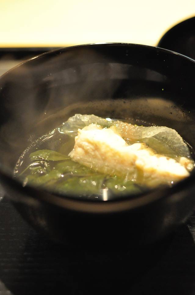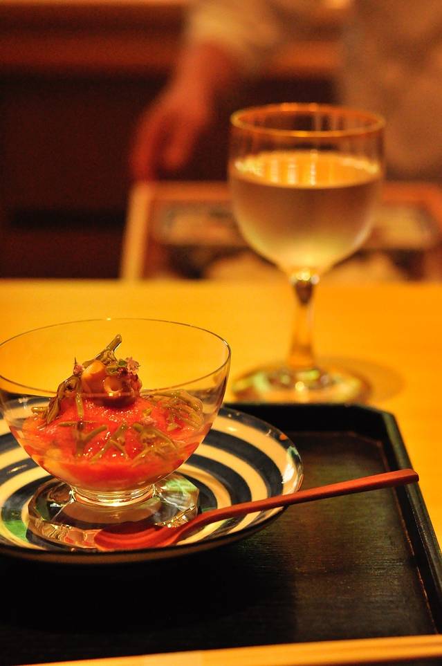 第一道,西红柿、莼菜混合什么忘了,只记得冰凉的感觉棒极了,太适合我一身厚厚的和服很解暑