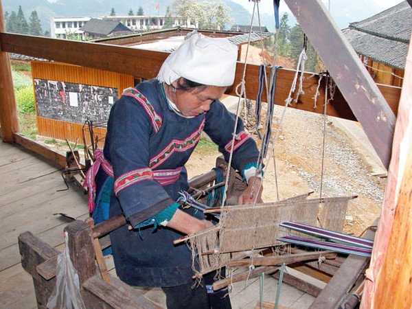 怎雷的民间工艺精美。剪纸主要是为刺绣而制作的底样,花样繁多,纤巧秀丽,主要纹样为龙、凤、麒麟、鹿以及花鸟鱼虫等。马尾绣是水族独有的一种刺绣形式,其以白色马尾为里,外缠白丝线,再用彩色丝线,将其钉绣在背扇等物件上,组合成各种图案,呈现出浅浮雕效果。这是一个在家中用古老的织机编织着彩带的妇女。