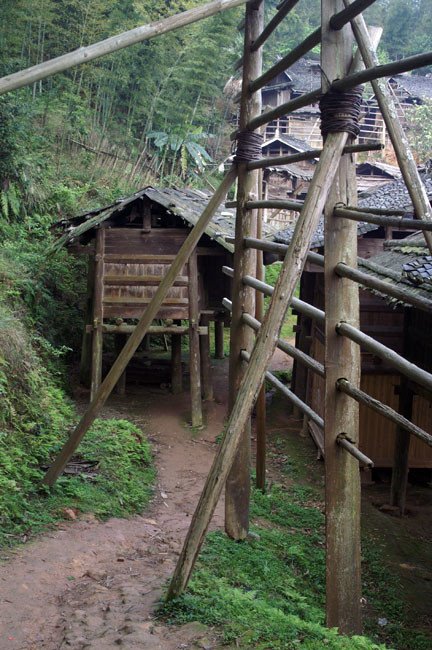 路边上有不少木制的粮仓和晾晒农作物的木架。