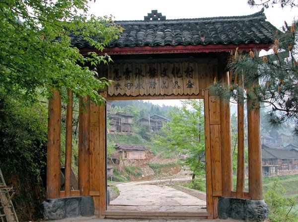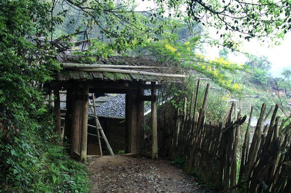 宰戈新寨则紧挨着大寨,也离公路不远,从公路上下去,要经过这绿树之中的小门。