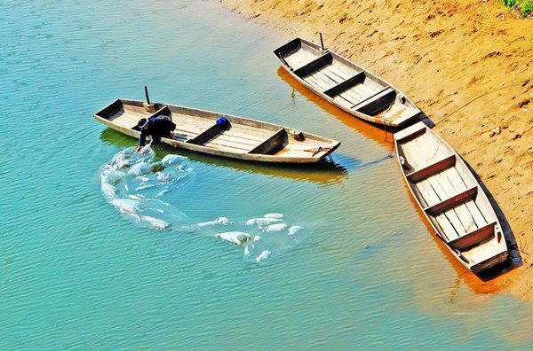 江上修筑的拦河坝形成的水库里,被淹没在水中的树木已枯萎,系在树边的小船、养鱼的网箱,以及它们在水中的倒影,构成各种黑白的线条,多少带有一些诗意。