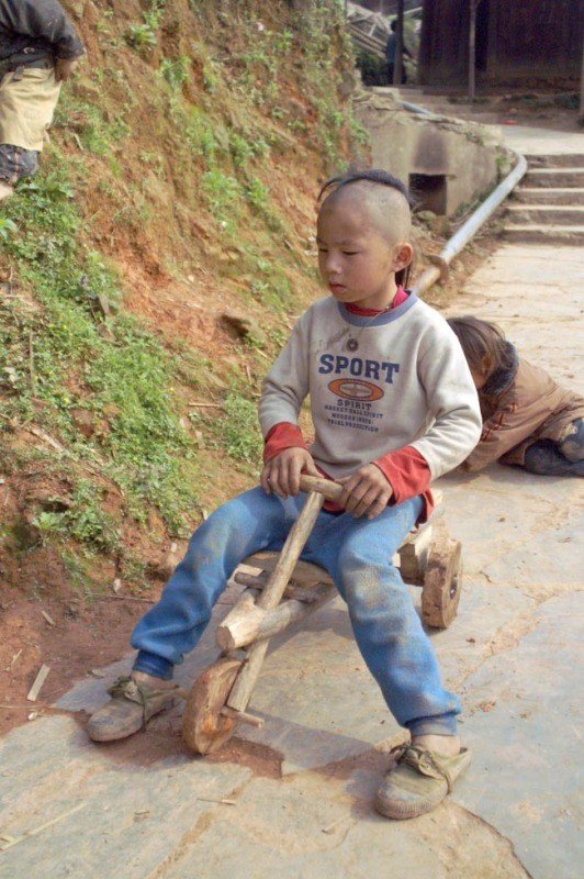 在通往大寨的路边,两个岜沙苗族儿童玩耍着用木头制作的“三轮车”,虽然工艺有些粗糙,但这辆车包含着多少他们父辈的爱,同时也可看出岜沙人的智慧。