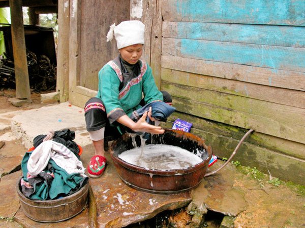水族女子的服饰颇具特色,其衣脚幅面窄小,岔高摆圆,花边为色泽明显的大万字和月季花;头上包白色或黑方格白布头巾,头巾收扎于颈后,形象古朴。虽然如今洗衣机已在大多数地方普及,寨中的水族妇女依然采用最古老的方式洗涤着衣物。