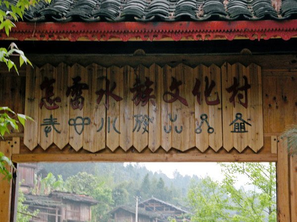 沿着图中的乡间盘山公路再前行六公里左右,来到怎雷水族文化村。该村处于都柳江与龙江上游分水岭的山脉中,东靠大山,西临都柳江支流排长河。据口述家族历史及祖坟墓碑记载推断,清康熙年间该寨先民迁居于此,约在清中期形成今天村寨规模。面积0.52平方公里,海拔约510—540米。全村现有221户,989人,韦姓占全村的98%。村寨倚山而建,分上寨、中寨和下寨,其间间 夹稻田和树林,上寨和中寨主要为水族村民居住,下寨主要为苗族村民居住。水族占65%,苗族占35%。日常生活中使用水族语言、苗语和汉语。在这里繁衍生息了300余年的水族、苗族同胞,至今仍保留和传承独有的典型文化特色,特别是200余栋民居建筑,多是从“杆栏式”木构建筑衍化而来的吊脚楼,保留了“杆栏”建筑的特殊营造印记,成为研究水族独特建筑风格的重要场所。其中百年以上“杆栏”民居有14栋,另有“杆栏式”建筑和禾仓111栋。是一个民族文化原生态保留得十分完好的水族村寨。