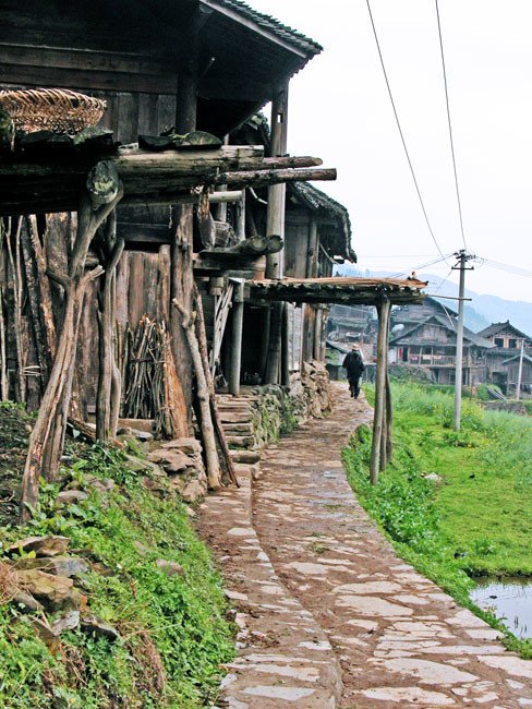 在清晨的绵绵春雨中,寨子内炊烟袅袅。