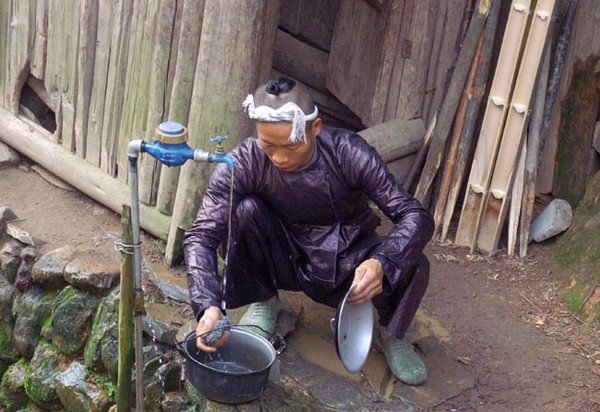 一个岜沙男子在用自来水清洗饭锅,他是岜沙苗族男子的典型装束。岜沙男人非常重视他们的发髻,发髻在岜沙苗语中称为:“户棍”,是男性装束中最重要的性别标志——剃掉男性头部四周大部分的头发,仅留下中部盘发为鬏髻,并终生保持这种发式。据说,这种装束是从蚩尤老祖宗时代传下来的,也是迄今为止在中国所能见到最古老的男性发式。曾有日本民族、民俗学家寻根来到黔东南,岜沙人还引起了他们浓厚的兴趣,因为日本的武士装束和岜沙人的装束几乎没有二样,所以有人认为日本人的祖先是岜沙人。