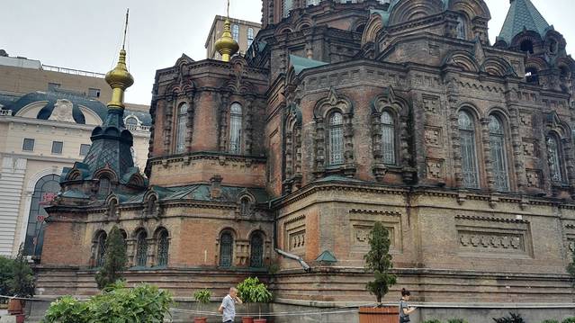 办理好房间后,我们在宾馆斜对面一家砂锅吃的午饭,感觉好象是连锁店似的,味道还可以,全是小砂锅,还有面条和饼,经济实惠。饭后步行大约十五分钟到秋林公司地下商场买红肠,送回宾馆车内后在秋林公司站点坐8路到防洪纪念塔下车,对面就是中央大街,吃马歇儿冰棍,逛中央大街。然后步行大约二十分钟到索菲亚教堂,现在教堂已经不让进了,门那都拦上了。因为时间还早,又步行半个小时回到防洪纪念塔,在江边坐了一会,大约五点多钟,从车站坐8路到秋林公司下一站下车回宾馆。晚饭是在离宾馆大约八百米左右的小饭店吃的,名字不记得了,大概位置如左图,那家饭店边上是一家稍大点的饭店,装修更好,但我们选择了边上看上去较小的一家,事实证明,小饭店味道不一定会差,要了四个菜一个花毛,刚好店家啤酒搞活动,我们喝的据说是最好的哈啤,好象是至尊1990,都说好喝。回宾馆说有晚安奶,去吧台取,但其实就是冲的奶粉,淡淡的,不好喝,不要也罢。