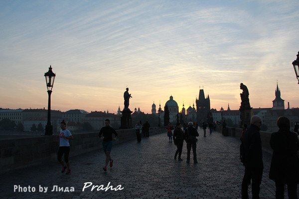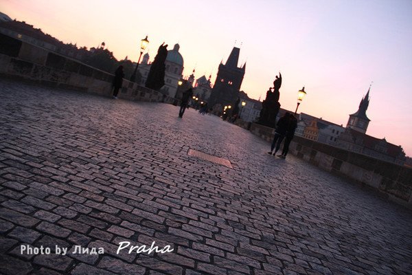 按耐不住早起的心情,沐着路灯的街道,查理大桥,同时等待日出的人...