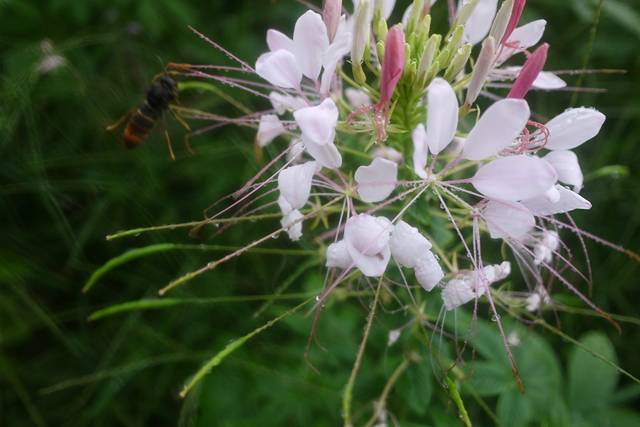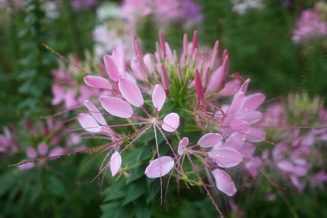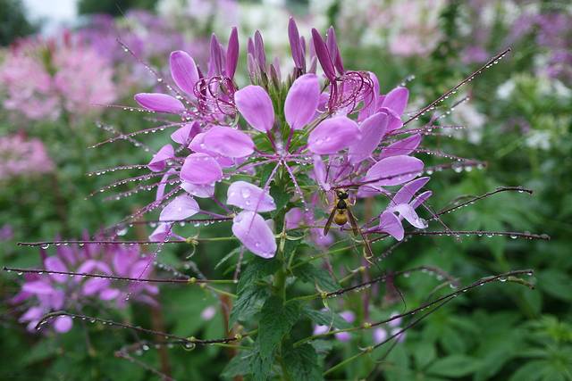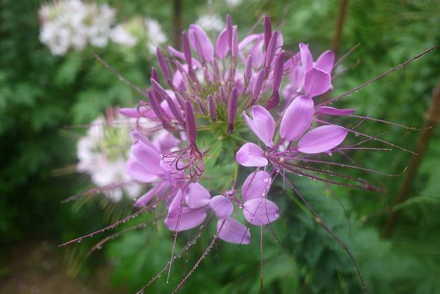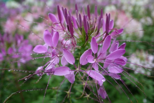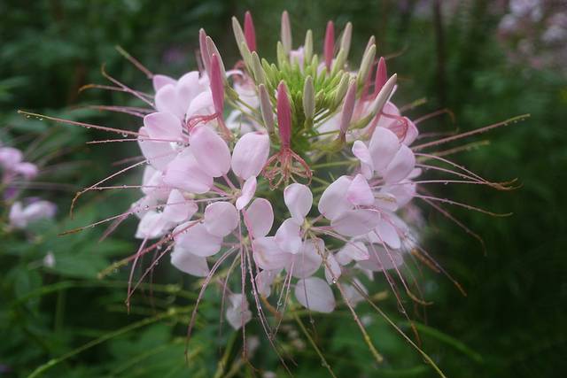 醉蝶花原产于南美洲热带地区,花梗长而壮实,花株高1米左右,盛开的花朵象彩楼上千金小姐抛出的绣球,又象节日绽放的烟花,花球圆大,直径达20厘米左右,花形优美别致;花瓣轻盈飘逸,团圆如扇,形似蝴蝶飞舞;长长的花蕊伸出花冠之外,如爪,如蜘蛛,又如龙须;花色娇艳,有白色、粉色、紫色:白色有粉白、纯白,粉色有深粉、浅粉,紫色又有红紫、淡紫。深浅相间,红白相依,煞是好看;就算同一朵花,由于花瓣次第开放:初为粉白,次转粉红,后变紫红,更形成一花多色,甚为奇妙;花蜜丰富,花香浓馥,连蜜蜂也不惧霏霏秋雨,陶醉其中,若是晴天,岂不更令飞蝶陶醉?我想,这么诗意的名字应该就是由此而来的吧。