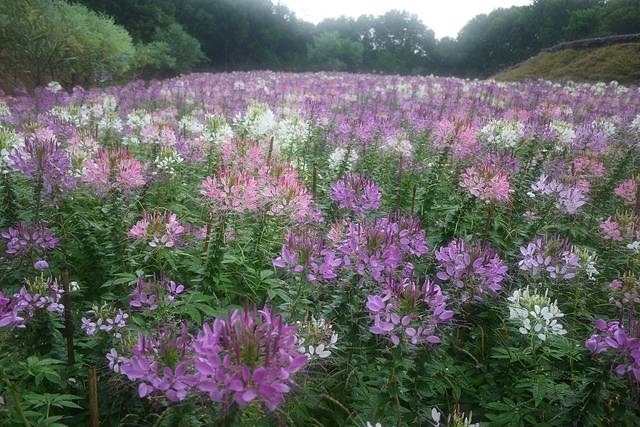 娇艳的醉蝶花就是这样将一幅姹紫嫣红的美丽画卷、彩色花毯,毫无保留地展现在我们面前。霏霏细雨,为醉蝶花洒下了无数晶莹剔透的水珠,使其显得更为娇嫩、羞答,更使整个景区和花海成了薄雾缭绕的人间仙境。