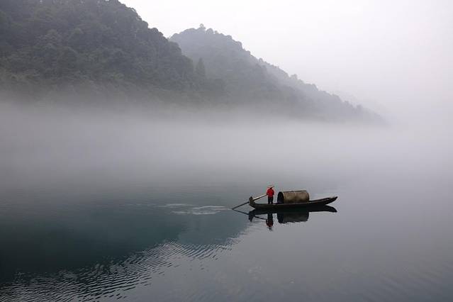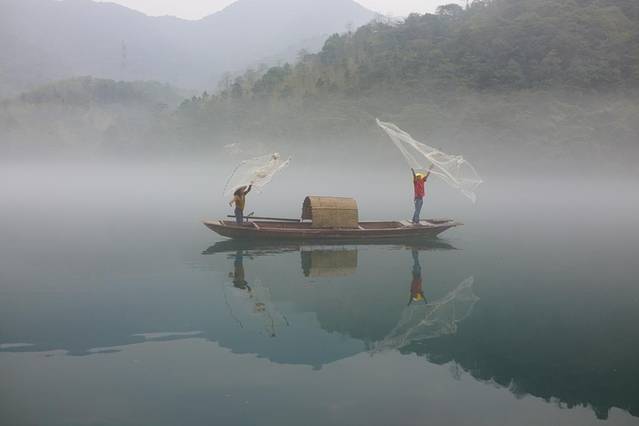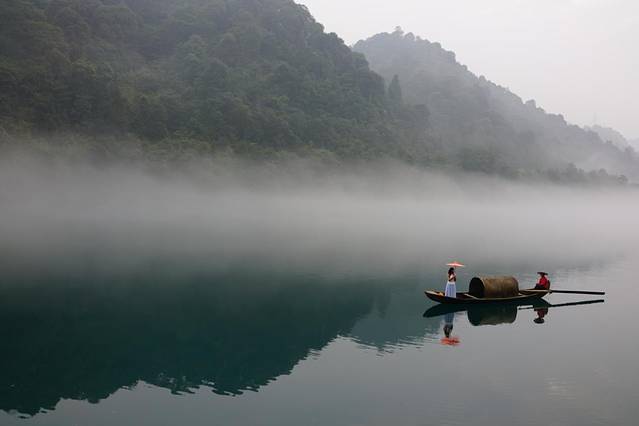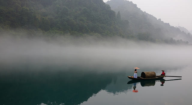 雾漫小东江位于风景区北面的主入口处,由上游的东江水电站和下游的东江水电站而成,为长约10公里的一条狭长平湖。
