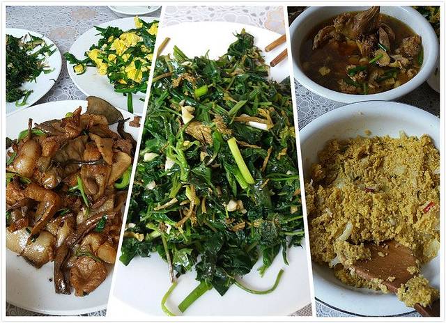 饮食也颇有当地特色。我们的午餐:山韭菜炒鸡蛋,凉拌野菜、干菜五花肉,炖笨鸡子,还有超好吃的小米稠饭。