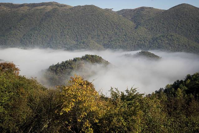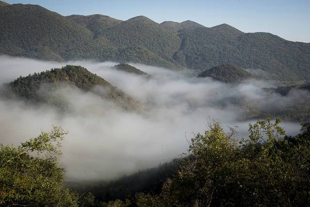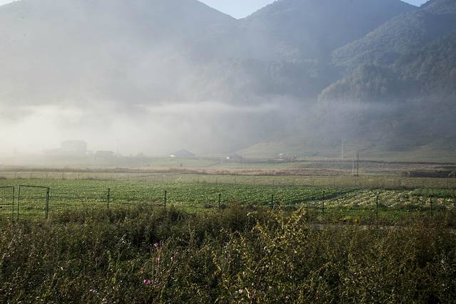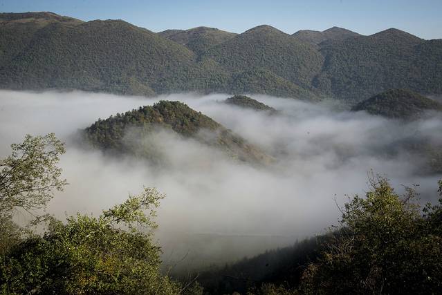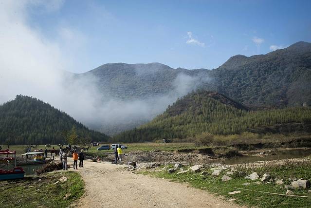 第二天早起,就往西流溪而去(老板说有32Km),行走只有几公里,就见晨雾飘起.