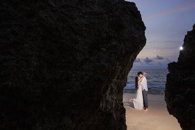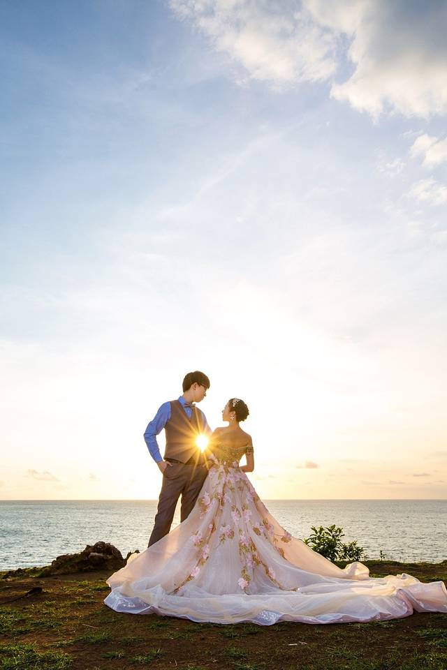 前往第二个外景拍摄地,库塔海滩上的悬崖。这条礼服,可以说是我最喜欢的,夕阳的余光照在上面,熠熠生辉。当摄影师拍到这张照片的,激动的直呼amazing!非常可爱的邀我过去看,当我看到这张时,我也想说Thanks God!我把它和另一张照片,放在一起,有种日月同辉的感觉。