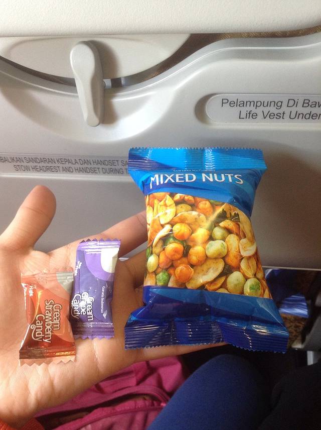 菜单餐品分为中西餐两种,酒品饮料很齐全,我对番石榴汁(guava juice)情有独钟。妈妈要了牛奶,比超市的浓多了。这个豆豆很好吃,后来老妈在超市也买了很多。值得一提的是,座椅背后已为乘客准备好毛毯,毛绒袜,眼罩等贴心物件,以免乘客在飞行中感冒。不用像国内航班似的需要向空姐要。巴厘岛人民的友好有种润物细无声的感觉。