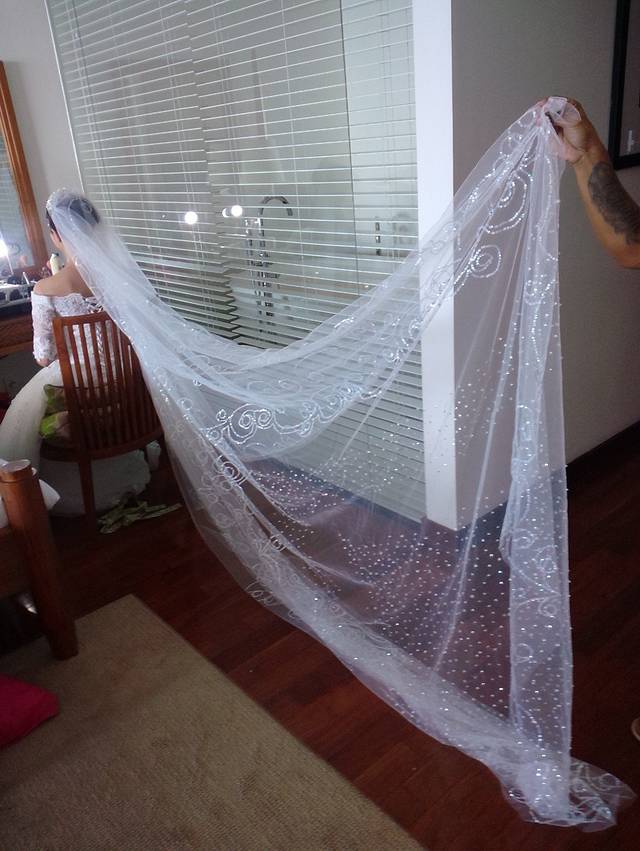 给大家展示一下我超级喜欢的头纱。当曹姐把它展开在我面前的时候,立刻让我想到茜茜公主那及地的头纱,我就知道就是它了。