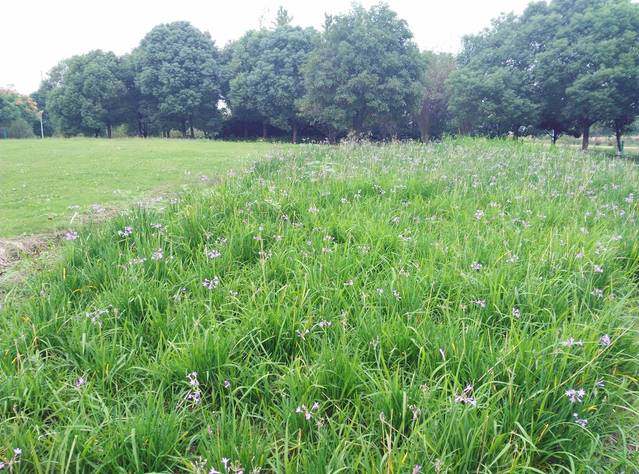 九里河湿地整个花境风格以自然野趣为主,公园内的广场,水面,绿地分布各有千秋。门户特色种植区位于锡沪路以南,九里河以北的7.9公顷面积中,入口处的公园广场设置具有标志性的景墙。这一区域形成城市界面与生态公园的过渡区,通过规则的树阵与特色灌木带的序列变化形成富有节奏感的韵律变化。