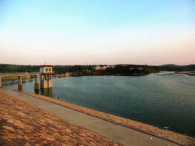 站在大坝的观景石栏边向远处遥望,只见四周绿树环绕。更远一些,高低错落的房屋,掩映其中。再看库中水面宽阔,碧波荡漾,那清清的湖水,像绿绸、像碧玉……景外有景,湖光山色,美不胜收,让人仿佛来到了世外桃源。三三两两游人,或在河堤上嬉戏、漫步,或在岸边闲坐、垂钓,或在水边的餐馆内品尝水库自产的鲜鱼,一副闲适景象。