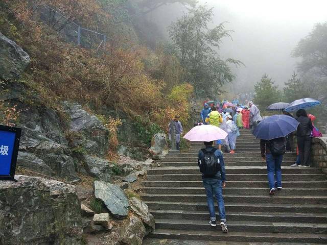 下雨的泰山魅力独特,是的,我们在高处甚至看不到它的细节,无法品味它的威严,可是就在云雾笼罩,就在10外看不到景象的情形下,这是种全身心的初体验,这是对毅力和耐心的考验,是对脚下每一步的肯定。越往高处走,大家话越少,过多的言语只会浪费体力,只有相互扶持才能走出迷茫。