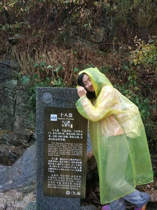 第二天7点出发去泰山,背了些食物,吃了早点,其实天已经开始下起小雨,不过就算是这样,我们对于泰山的热情仍然不退,打车到泰山脚下,人很多,在山上不建议打伞,就买了雨衣。我的经验教训就是未来了不让鞋湿,强烈建议大家在脚上套塑料袋,若是怕滑,就穿在鞋里,这样脚会舒服些,当然这种建议只是在雨天。其实泰山不陡,挺好爬,只有十八盘确实折磨人,剩下的山路,只要坚持,都不是什么难事。