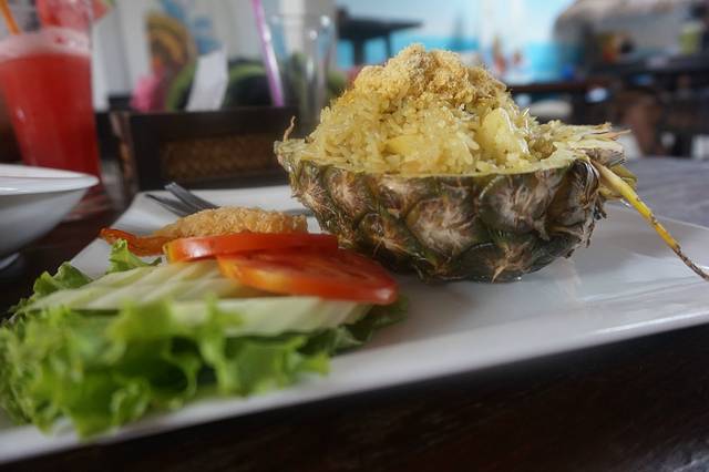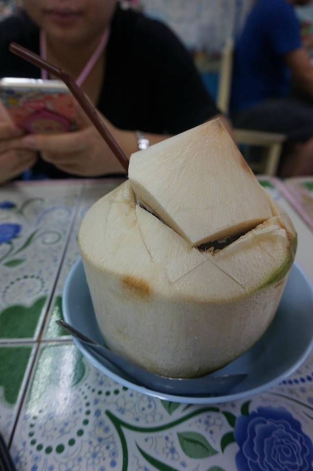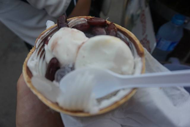 古城内很多饭店跟小吃摊档 , 这是椰子汁