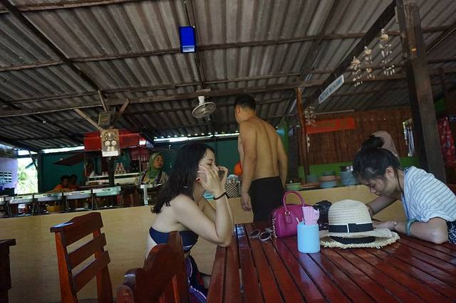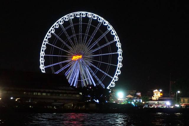 乘坐天铁我们来到了河畔夜市,乘坐免费的船可以直接到达哟,顺便可以看看河边两岸景色,真是划算,免费游船的时间从下午四点半到晚上十一点半。这边有一个人妖秀场叫做克里索普人妖秀,不过我们到达的时间比较晚,而且这里的人妖秀比较贵,所以后来我们还是选择去到普吉再看了,这边的建筑主要偏欧式吧,比较复古,一大特色是那个摩天轮,好多情侣在摩天轮下合影,当然我们也有啦,哈哈,不然怎么叫做蜜月之旅嘛,来到异国嘛,放得还是会比较开的