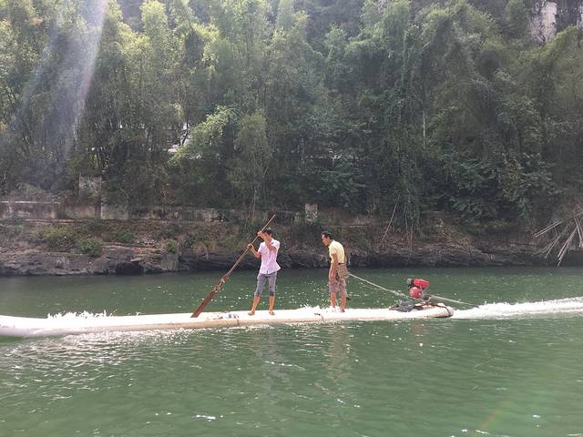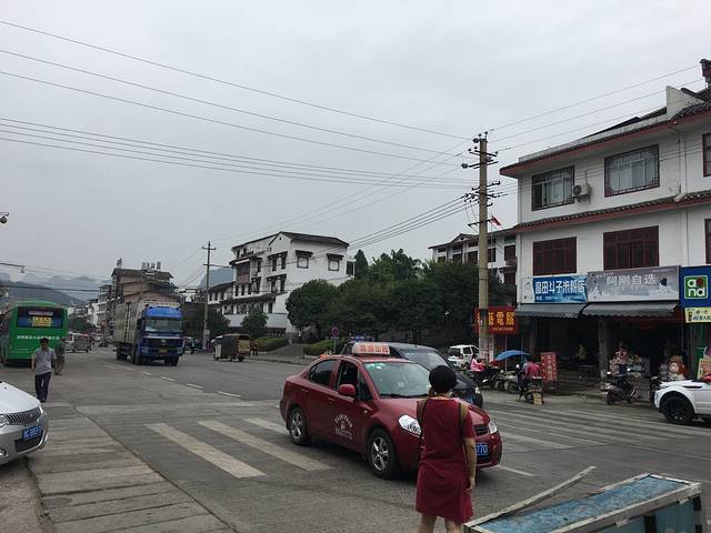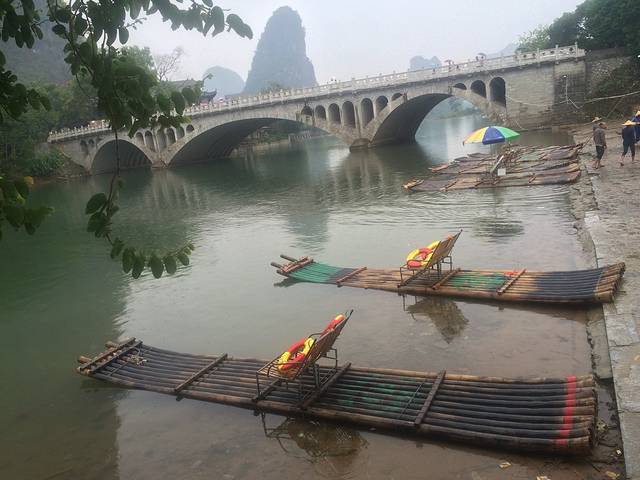 从黄姚直接坐车到阳朔,车费50元(需讲价),2小时,但只坐到高速路口,然后还得转个公交车3块钱,很多公交都到,高速路口下车后一直往上走,会看到一个直升飞机展,其实就一架飞机在那,然后再往前走,走到前面岔路口等公交,这边的公交是随时都可以停的!到达西街口映入眼帘的全是啤酒鱼,有那么好吃吗?我们到了客栈后,匆匆忙忙的放下行李,然后去坐竹筏游漓江,票价是55元一人!