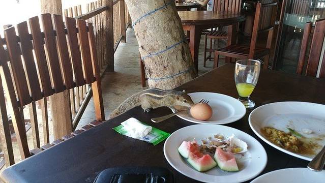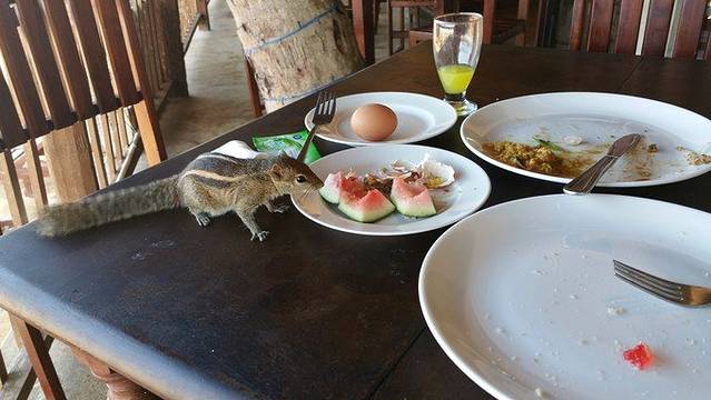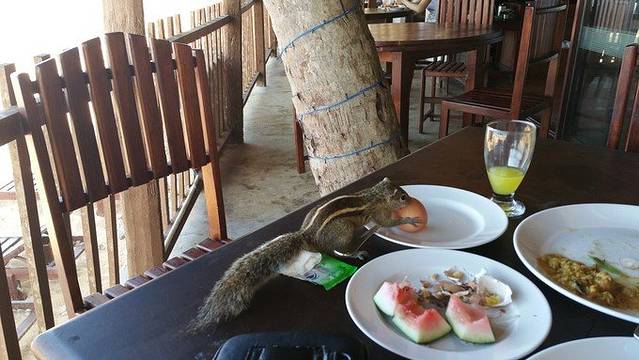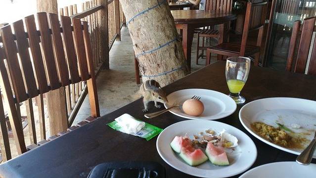 米利沙日落酒店的餐厅临海而建,面朝大海一侧除了木质栏杆外和屋顶铺设的茅草外,没有任何隔断,所以每天都会有小松鼠跑进餐厅里,吃客人剩下的食物。