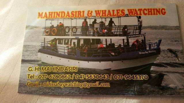比较了多家赏鲸公司的报价和服务后,我最终选择了一家名为Mahinda siri Whales Watching的赏鲸公司参团,而价格也从最初的2800卢比每人讲价讲到了每人2500卢比(包含早餐,和去程的美蕊沙海滩至harbour的嘟嘟车),今天先交400卢比的预付款,剩余费用明早出发时补交齐就可以。凭订单收据明早6点半准时在海滩集合。是他家的名片和电子邮箱,如果有需要的可以联系他们。
