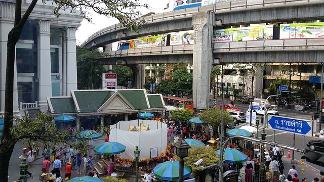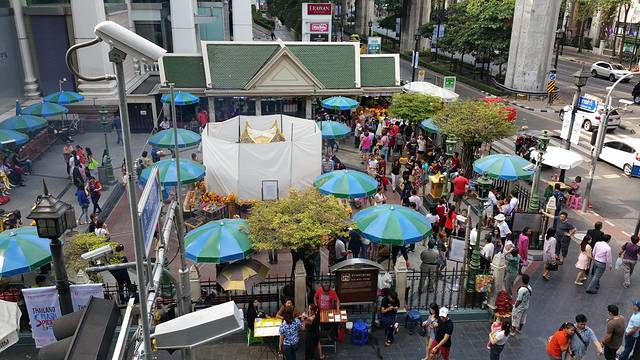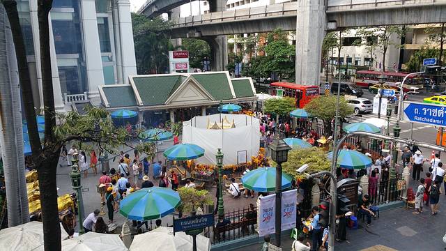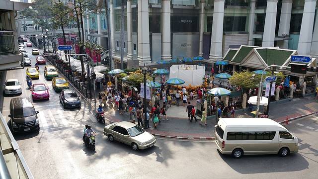 四面佛位于世贸中心(Central World)斜对面,搭乘BTS轻轨素坤逸线(Sukhumvit Line)在Chit Lom站下车后,从2号口出出站,沿人行天桥往Central World商场方向步行3分钟,左手边即可到达(很好找,老远就可以听见“叮叮咚咚”的礼佛乐声)。