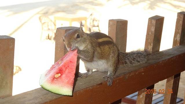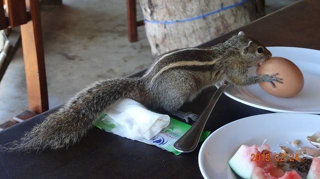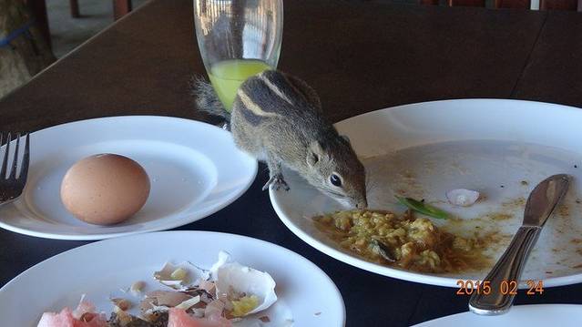这的松鼠尾巴超大,非常可爱,也不太怕人,我观察了下,这松鼠最爱吃的是煎蛋和咖喱鱼,其次是西瓜和吐司!