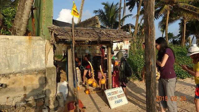在米利沙日落酒店隔壁,有一间茅草屋售卖斯里兰卡著名的金椰(the king coconut),每个金椰售价50卢比,这位大叔应该是整片美蕊沙海滩上唯一的一个售卖金椰的商户,生意好到爆,基本上属于砍椰子都砍不过来的节奏,炎炎烈日下,中国人欧美人都找他来买椰子。
