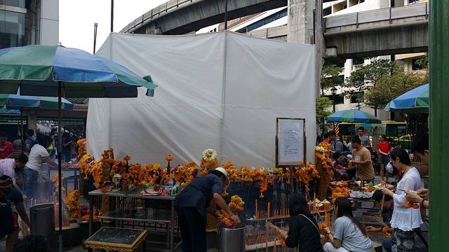 另外,从Chit Lom站往Central World方向步行途中,同样也是在左手边,在还没到伊拉旺神祠四面佛处(屈臣氏旁边),另供奉有一尊玉制的四面佛,该佛通体呈墨绿色,也有很多当地人前来敬拜。