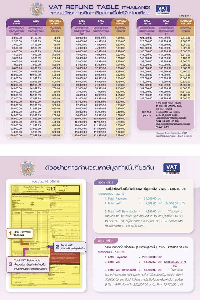 基本上,在泰国只要买超过2000铢,就可以办理退税手续,一般的百货公司(如Central World、百丽宫等)、商场、乃至某些超市(例如Big C),都可以退税,不过从2013年9月1日起,泰国退税的规定有了大幅度的改变,一是从原来不论是买多少金额(最低不能低于2000泰铢)都是退7%的税改为阶梯式退税法,退税比例从4%~6%,单一店家买得越多越贵、退税额度也就越多。(详细退税金额请参考本文最下方的对照表)二是取消了的100泰铢退税手续费,也就是你可以实拿全部的退税金额,不用再多付一分手续费。