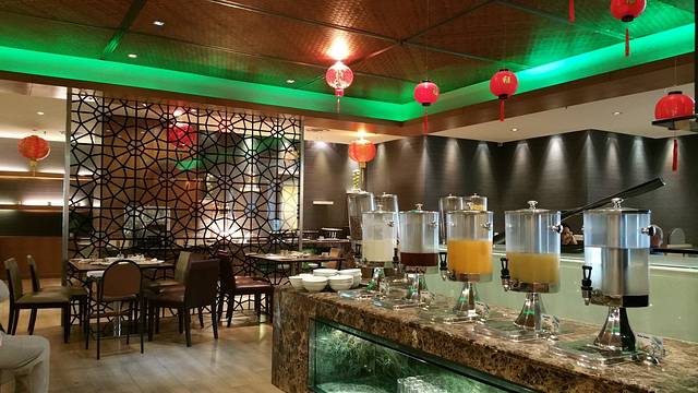 到了酒店餐厅,我瞬间惊呆了,整间餐厅空空荡荡,除了三四个服务员和一大桌的菜品外,这会儿就我一人用餐,感觉偌大的餐厅被我一人包场了
