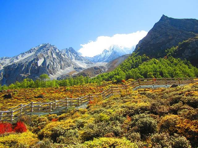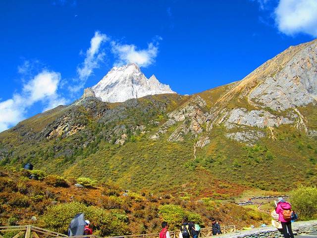 从冲古寺,有两种选择,一种是沿着木栈道,一种是直接搭乘电瓶车,都可以去到洛绒牛场。7公里的路程,步行需要2.5个小时,电瓶车大概是20分钟。因为想要徒步登山,所以我们在这里直接选择了电瓶车。一起从康定到稻城的小伙伴,没有选择爬山,直接走了这条木栈道,也是一种体验。