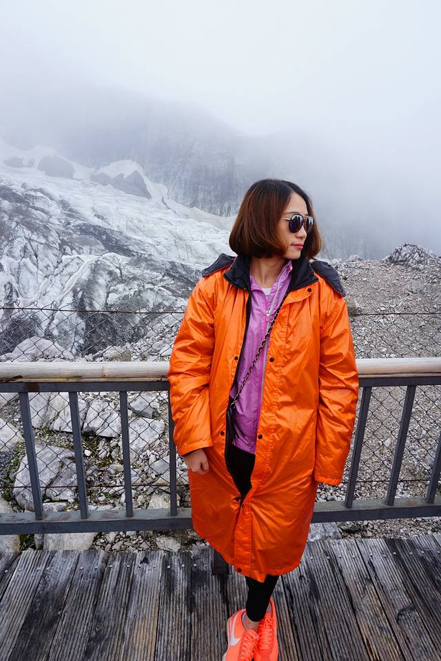 在到雪山之前停在了一个不知道有什么的景点,司机说一定要下去照照相,搞定后就上车去雪山。因为是旅游旺季,玉龙雪山的缆车如果去的晚需要排很久的队,我们去到的时候人还不算特别多,司机大叔每人发了一件冲锋衣、一瓶便携式氧气瓶和一瓶水(雪山三宝),我们开始排队坐缆车上4680的登山平台,结果因为淘宝店铺那边把老板娘的身份证号打错了,拖了整整半小时才进到缆车平台(现在雪山实行身份实名制,要刷身份证才能进去,但是如果有改动非常麻烦),所谓的早到也没了意义。
