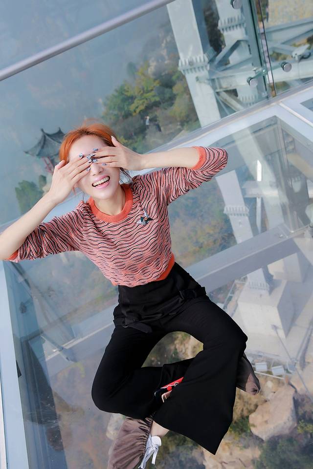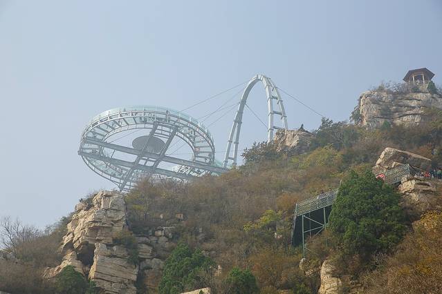 到达了缆车目的地后还需要再爬半小时左右的山才会到达著名的钛合金飞碟玻璃观景台,看到此景真让人心跳加速,悬空跨度32.8米的观景台,比美国科罗拉多大峡谷的廊桥还长11.4米。