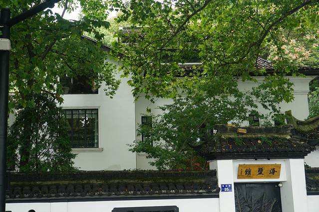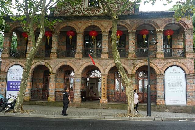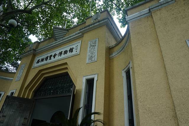 杭州西湖博览会博物馆与白堤遥相呼应,是一座带有欧式风格的黄色建筑,在绿树的掩映下,显得格外的醒目。