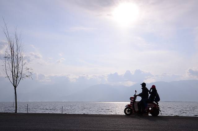 回客栈小睡一会,原计划租单车骑行的,由于到了大理,人都变懒了,改租电动车(到处都有)骑行洱海(小的40元/天,大台的50元/天,如果来回挖色的话,两人坐一台小的就够了)。