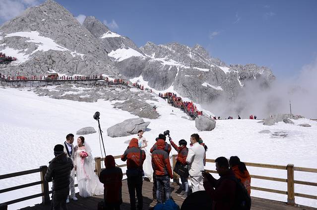 这里海拨4506米,十分钟上升1000多米海拨,先不急着出去看雪山,要慢慢来,在山顶休息室缓冲10分钟后,我们出门就给吓住了:在拍婚纱照,强!祝福您们!