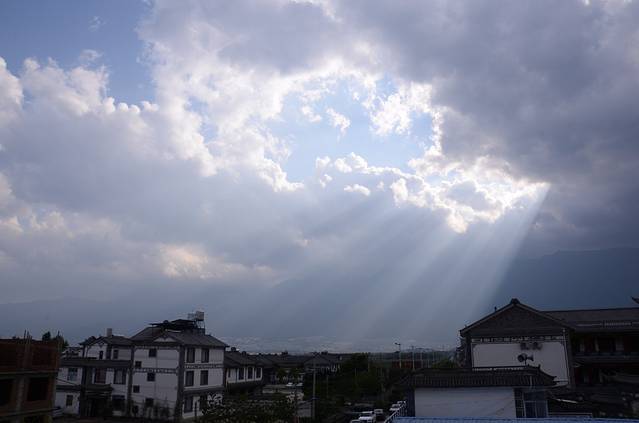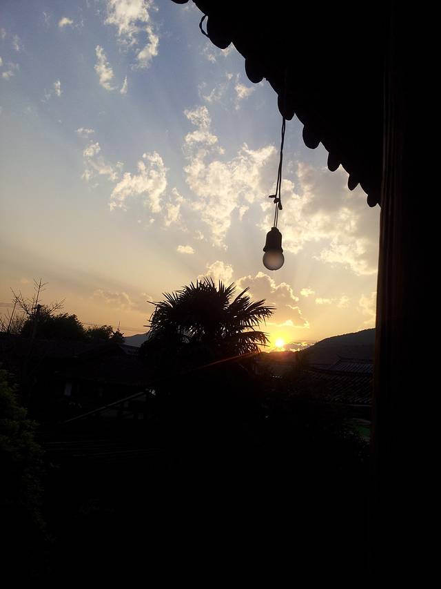 客栈里有各种主题的房间,还有健身房,而且楼顶的风光更好,刚好让我们拍到这一幕:太阳光线正好射在大理古城上。