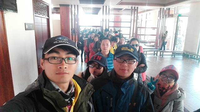 排队的时候大家又各饮了一支“葡萄糖注射液”防高反,顺便合照一张。说好的淡季呢?9:30分开始排队(排队前还要拿号,不过拿了也没用),10:58分离开队伍上了环保车,用时1小时28分。
