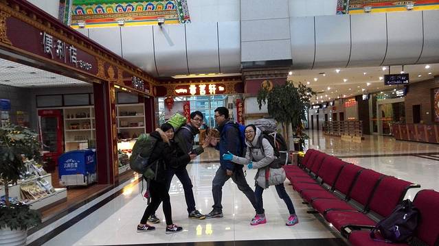 平安抵达香格里拉后,说好的不要兴奋,却都在机场内疯狂拍照。大家的背包都不小喔。。