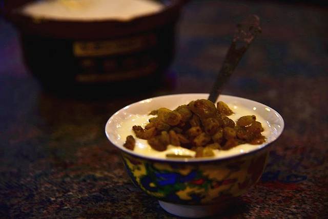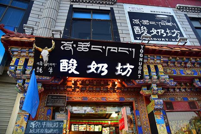 每当夜幕降临,在药王山的观景平台上有很多人来拍布宫的夜景,华灯初上,布达拉宫在夜色中显得更加壮观,在布宫的旁边有一家老酸奶坊,里面人气很旺,各种驴友的纸贴和照片,牦牛酸奶真的太酸了,加上白砂糖和葡萄干才算能入口,但味道确实不错