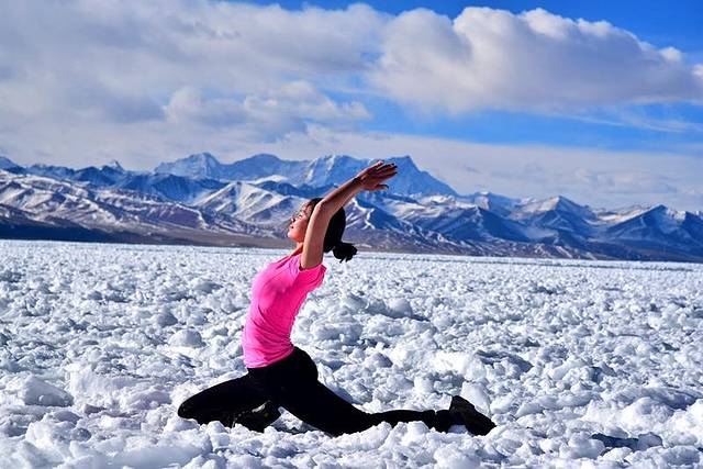 冬天的纳木错虽然美丽,但确实是太冷了,听说有人冬天在这里拍婚纱照,我也是服了,不过今天小伙伴在这里晒瑜伽,也是够拼的。