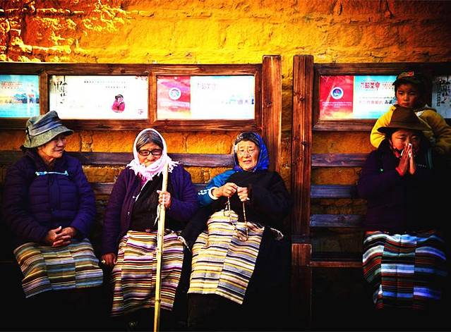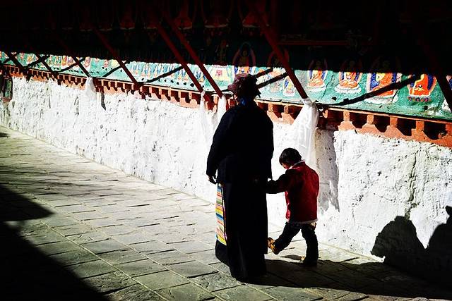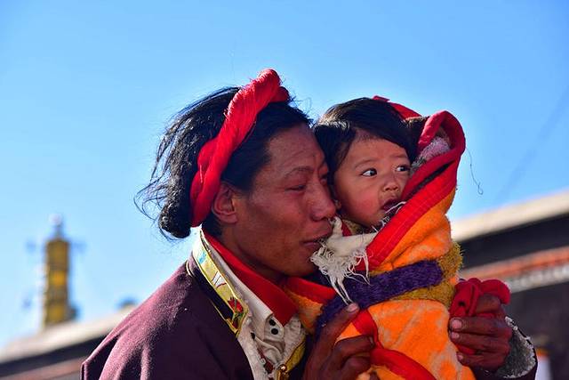 今天和藏民拥挤在窄窄的寺庙殿堂,可谓摩肩擦踵了,对于全名信教的藏民来说,拜佛就如穿衣吃饭一样,更是精神上的必需品,在这里,大小寺庙林立,上寺庙也不用门票,你可以坦然地用角票供佛,在没有角票地情况下,也可以毫无羞赧地从一堆供奉地钱堆里自行找零,也可以从家中带来自制地 酥油,添入佛前的酥油灯,如果都没有,只要你虔心向佛,也同样可以的得到佛的庇护,所以,佛在这里,是可以亲近地,佛是本心,是超越了的本心,佛亦是自然,犹如天地如你我。